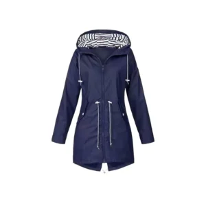 - Design: Long jacket with an attached hood for extra protection against wind and light rain. Front zipper closure with adjustable drawstring at the waist to enhance fit and keep warmth in.
